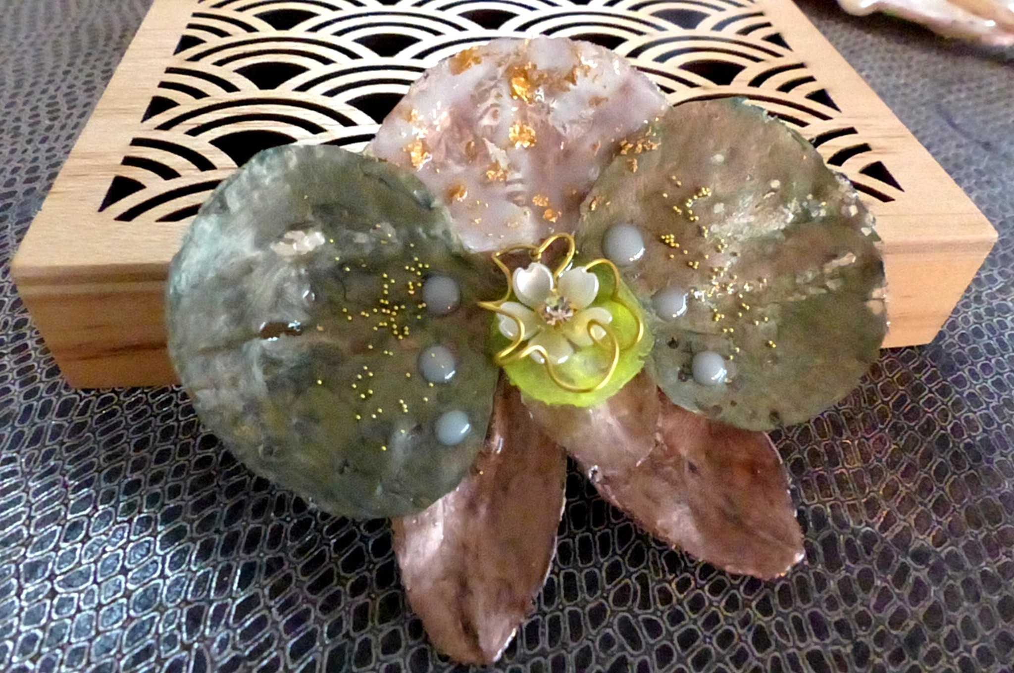 Orchidée résine déco, finesse et couleurs verte et marron cuivré