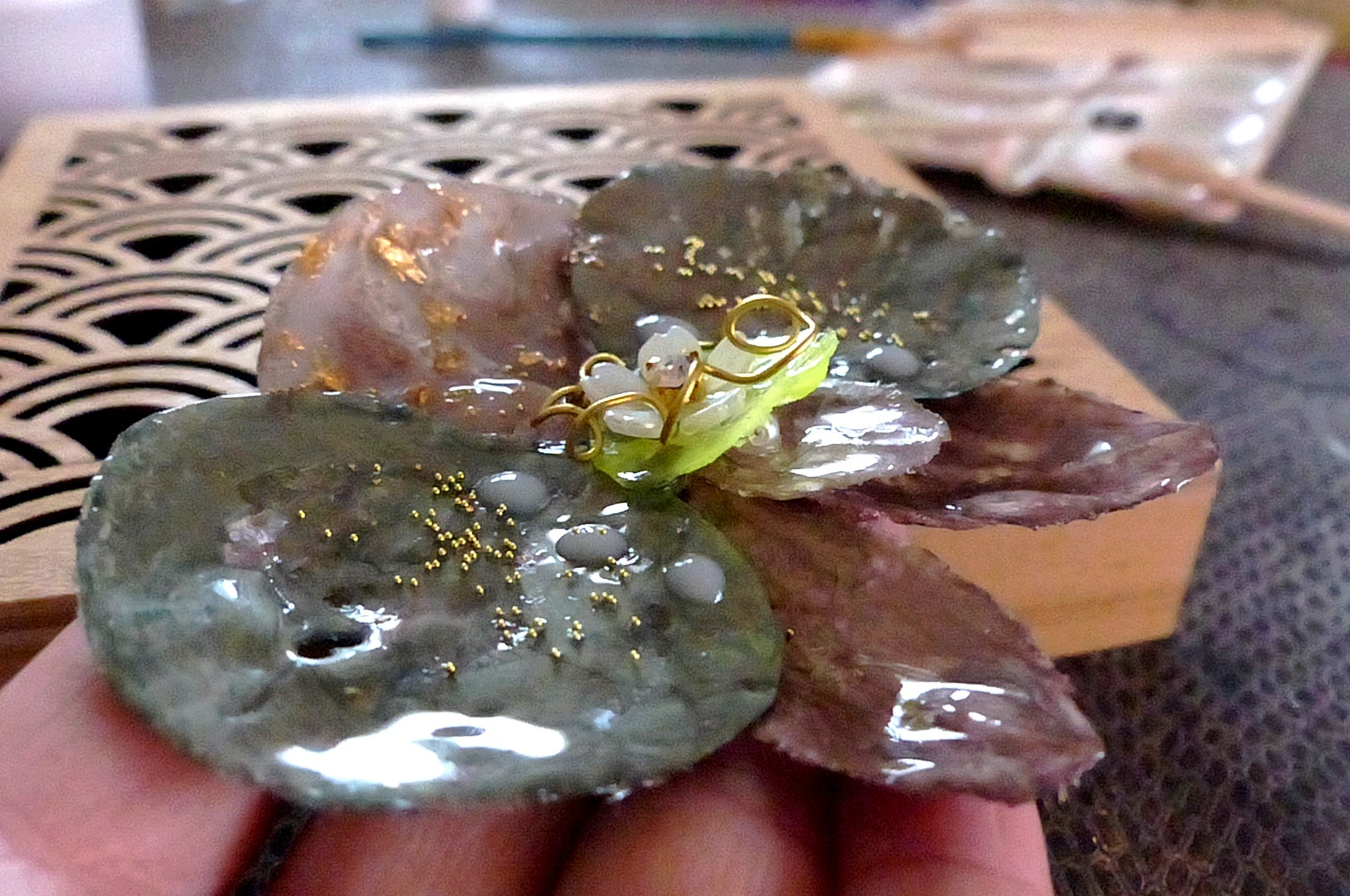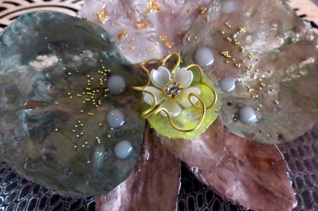 Au centre petite fleurette rajoutée et fil de laiton doré. Quelques goutes blanches pour fantaisie supplémentaire. Feuille d'or incrustée ainsi que micros billes de verre dorées.