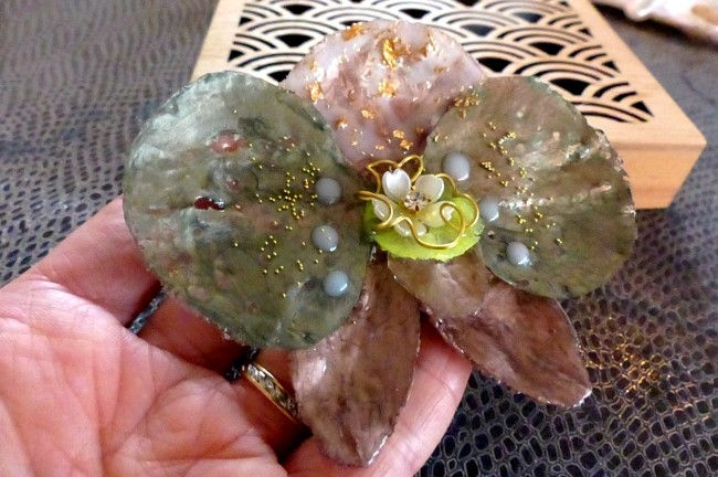 Belle Orchidée en résine, réalisée feuille par feuille pour lui donner sa forme finale avec empruntes de pétales dans les tons de vert-marron.