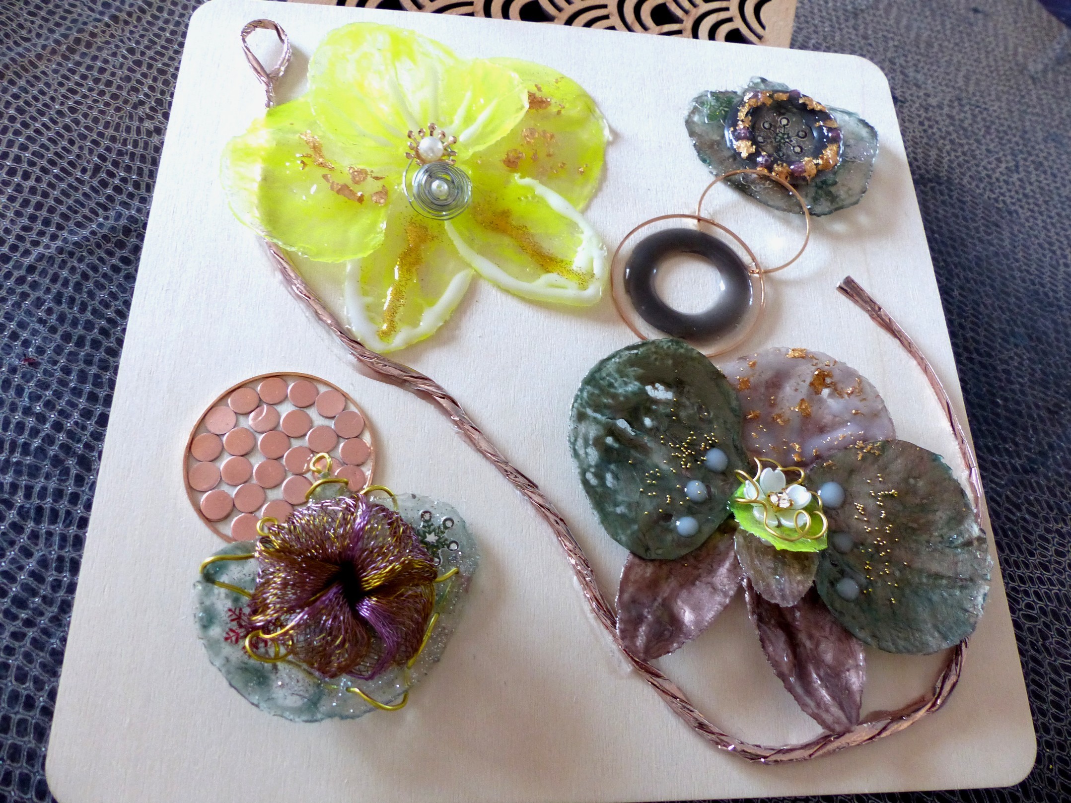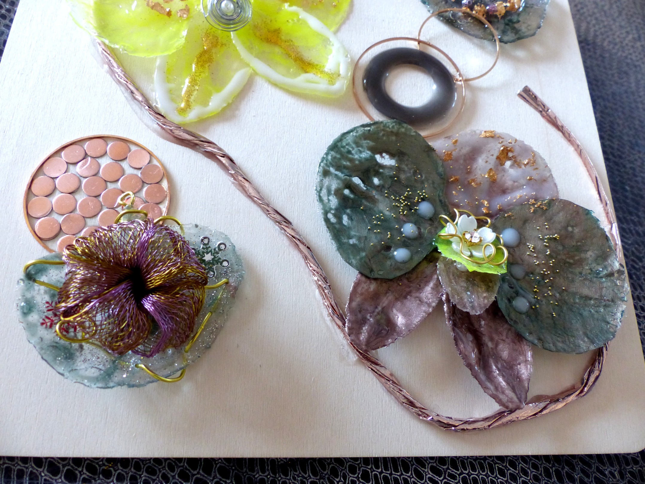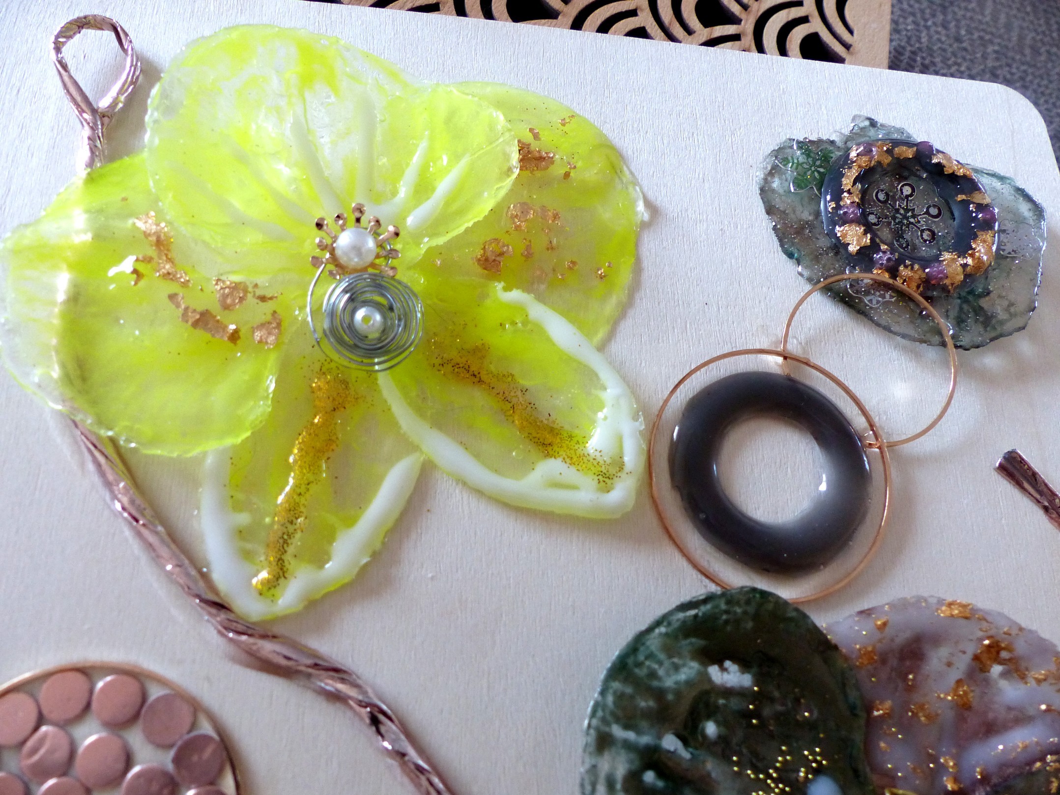 Tableau floral en placage Tilleul clair composée de 2 grandes et belles orchidées en résine l'une en jaune fluo et l'autre verte et marron cuivré, ornées de petits accessoires supplémentaires pour embellissement.