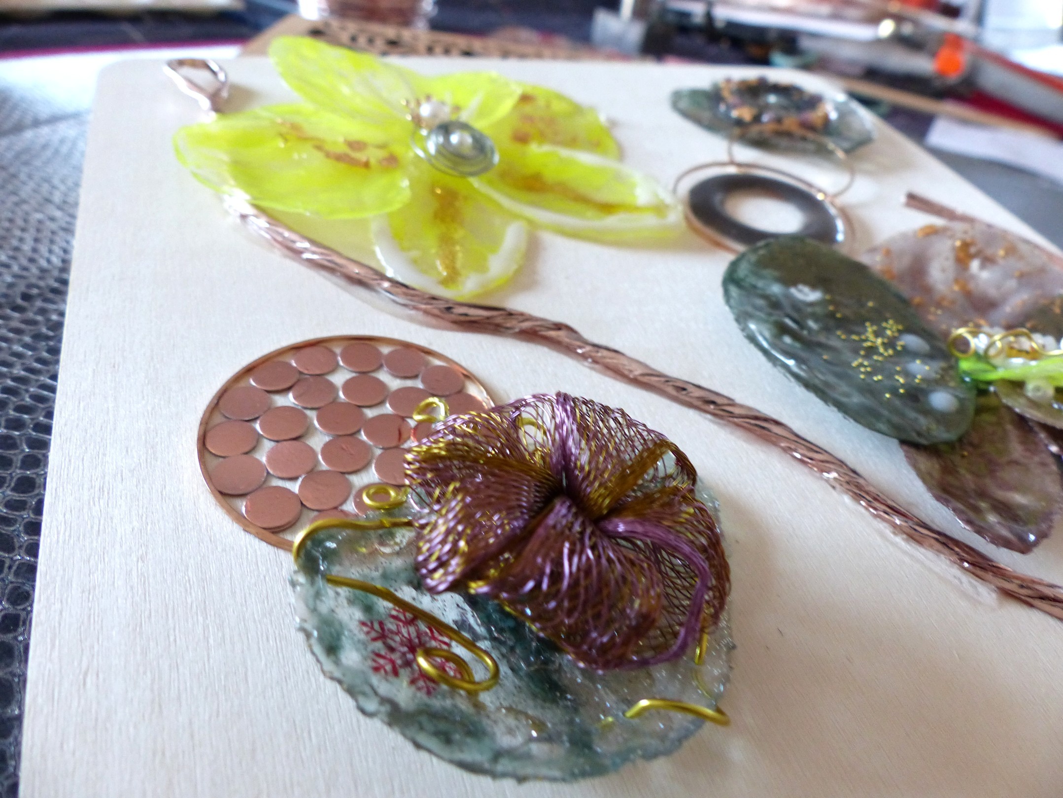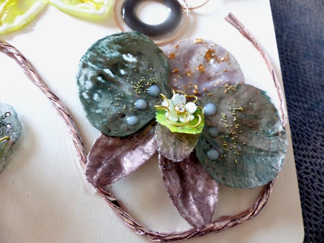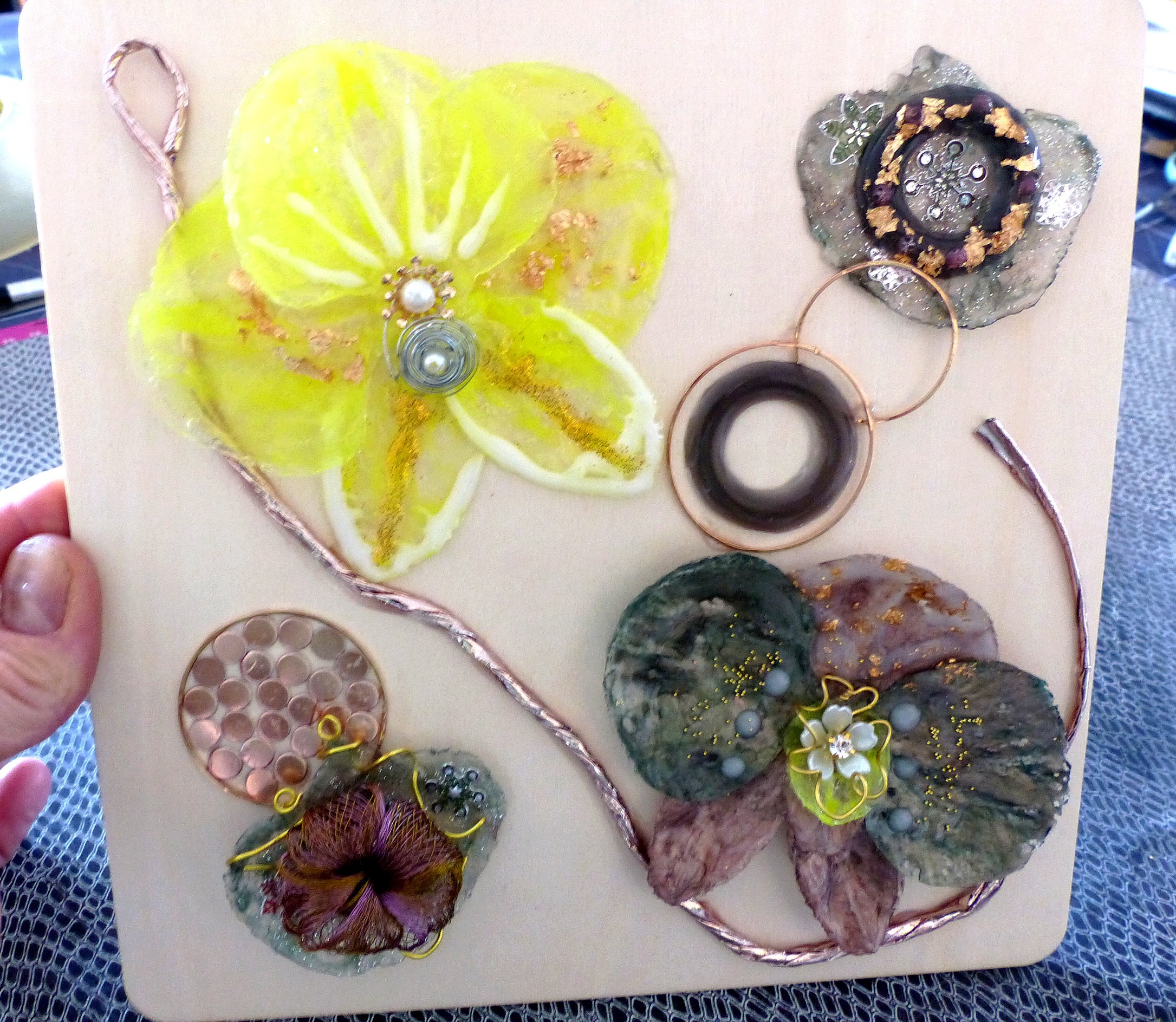 Tableau floral en placage Tilleul clair composée de 2 grandes et belles orchidées en résine l'une en jaune fluo et l'autre verte et marron cuivré, ornées de petits accessoires supplémentaires pour embellissement.