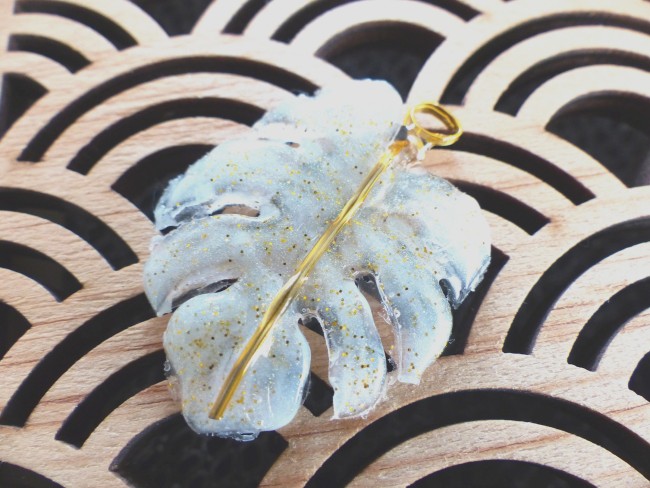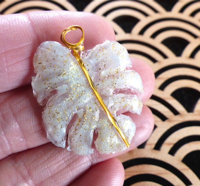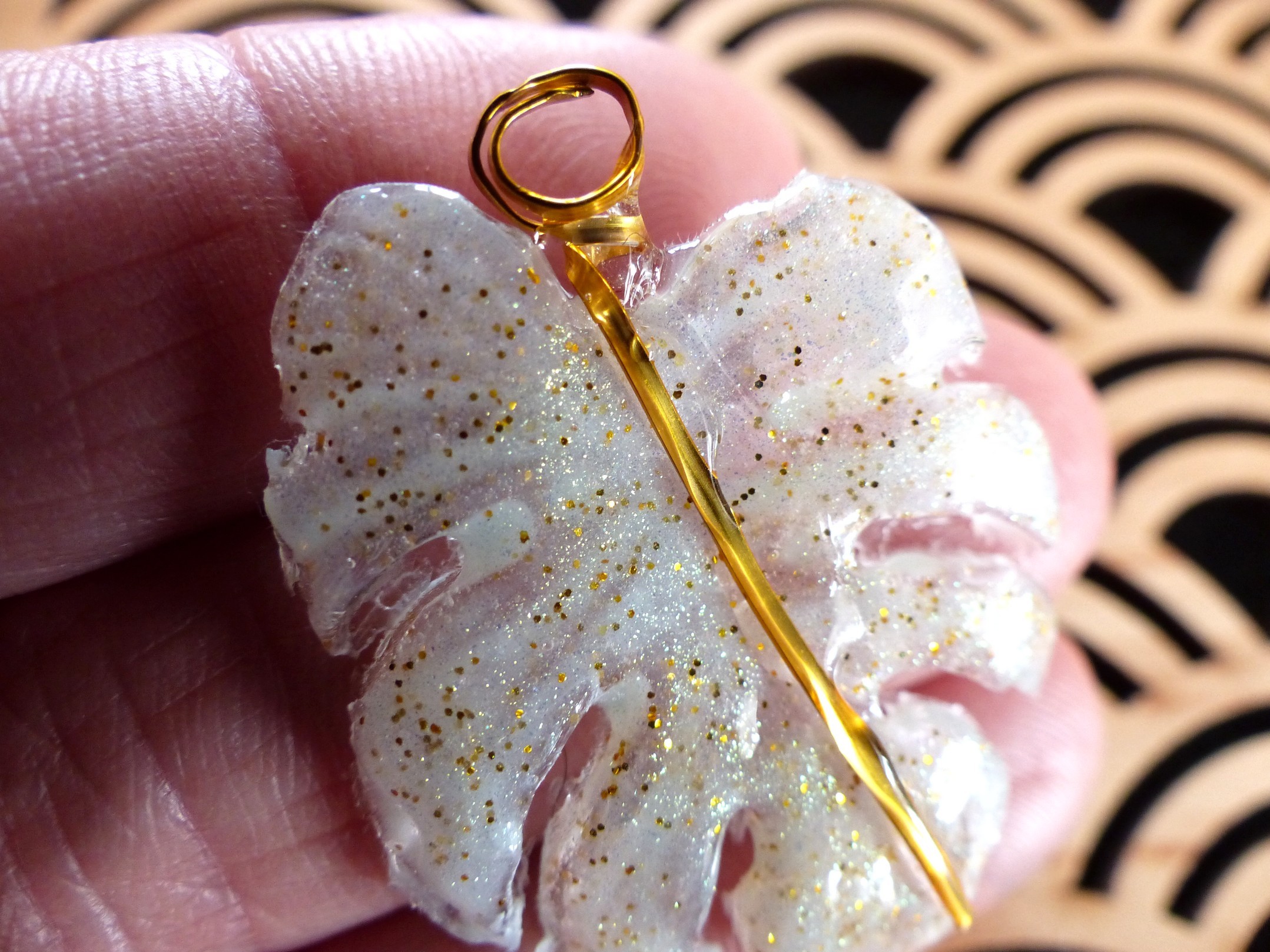 Pendentif résine en forme de petite feuille dans les tons de blanc pailleté et effet translucide à accrocher à une chaine fine bijoux.