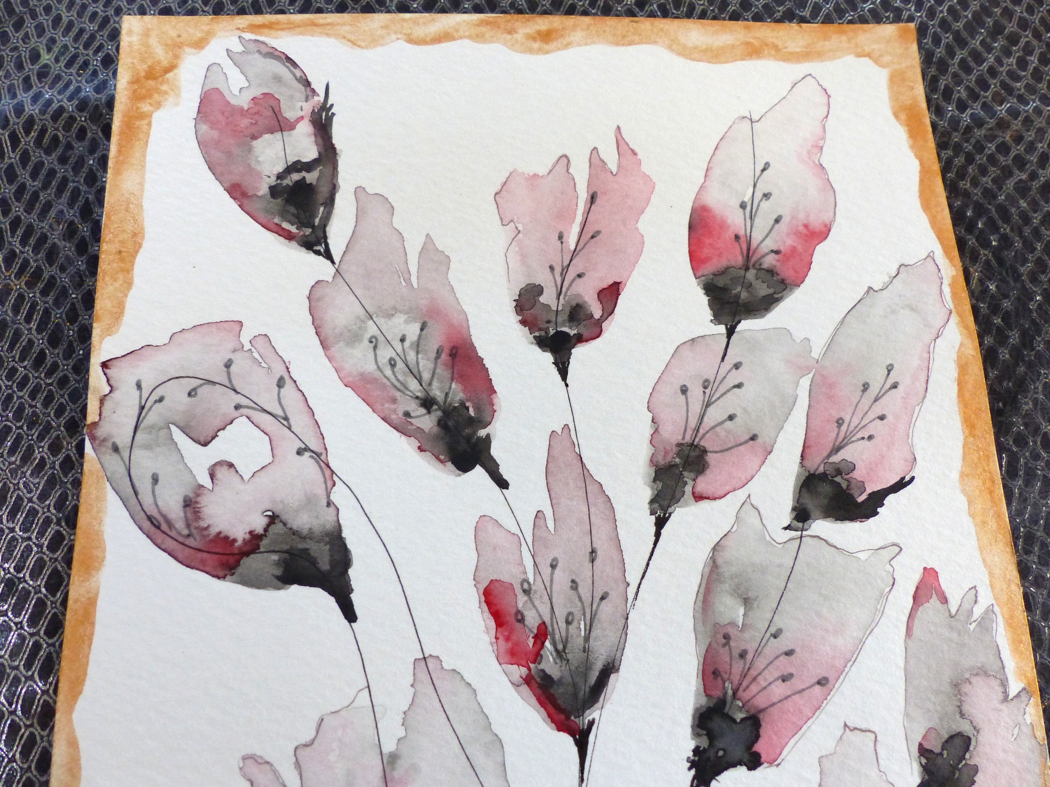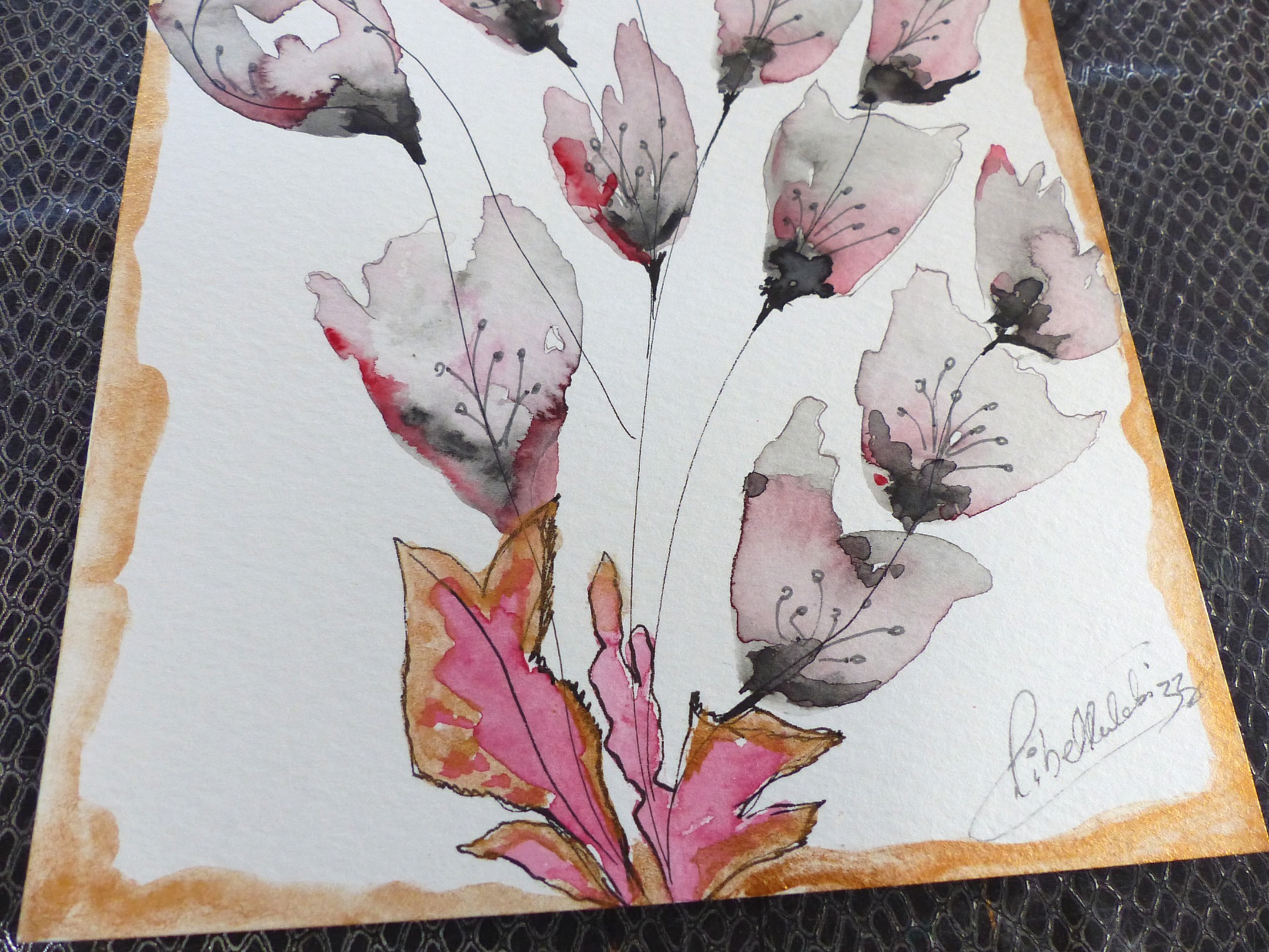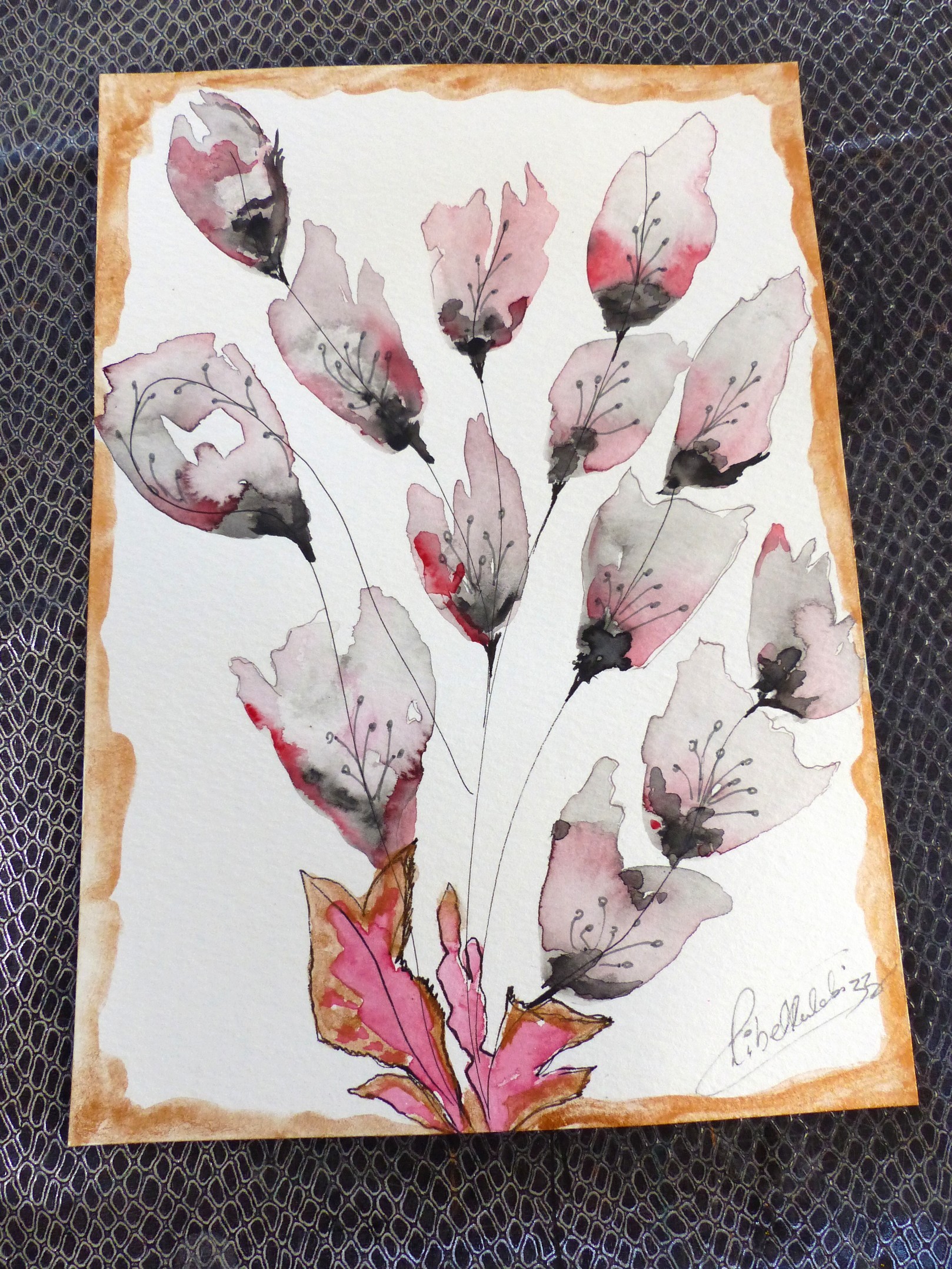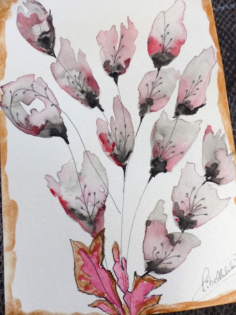 Aquarelle "fleurs imaginaires" avec la technique de la magie de l'eau et pigments aquarelle dans les tons de noir, gris et cuivré sur les bords. Notes de rose, rouge.
