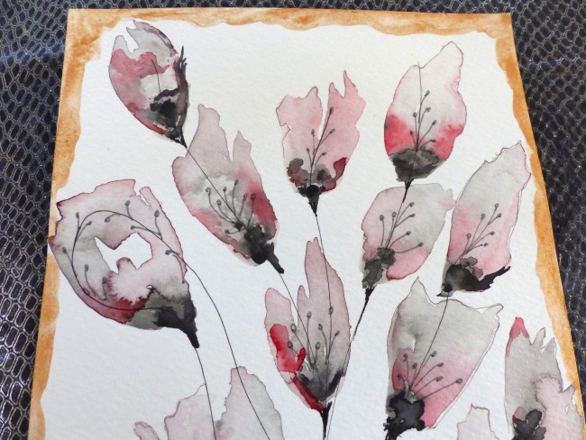 Aquarelle feuillage gris, noir et notes de rouge