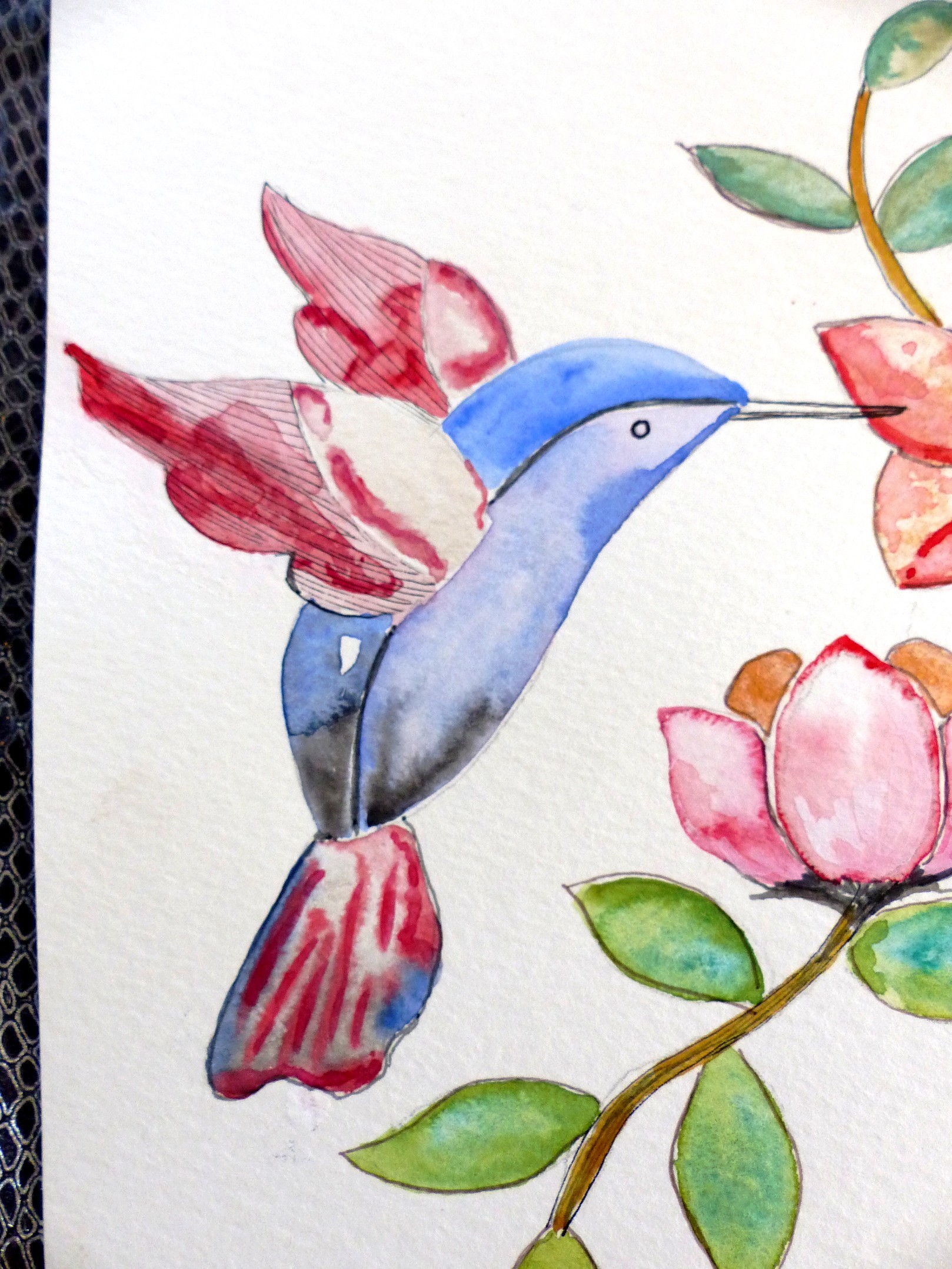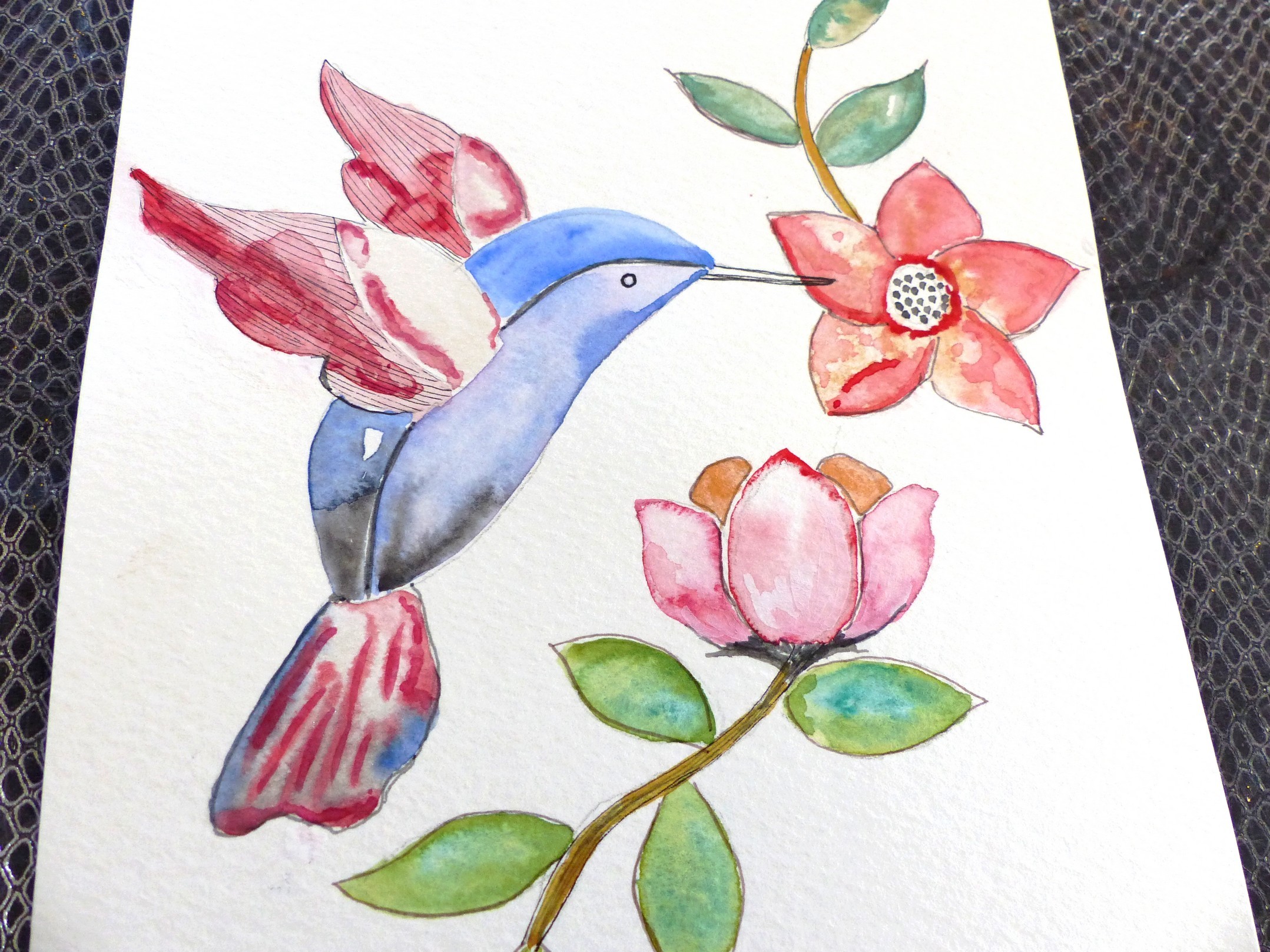 Aquarelle "colibri" et ses fleurs .. sur papier aquarelle de qualité.