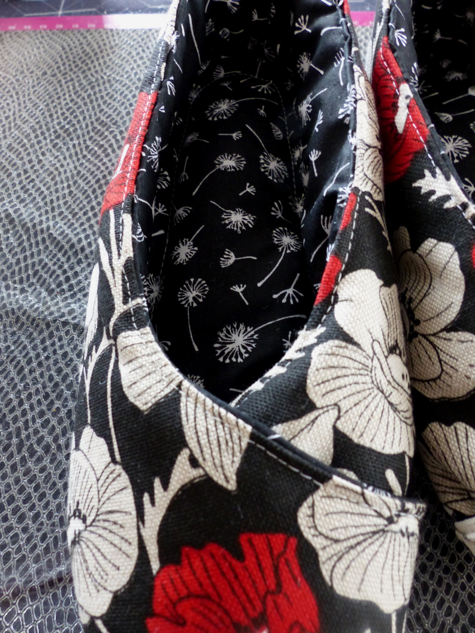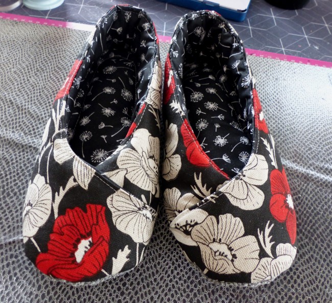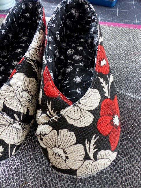 Chaussons femme kimono "coquelicots" fond noir réalisés main avec ce beau tissu aspect lin, toile fine aux dessins fleurs de coquelicots modernes, croisés sur le dessus pour plus de féminité.