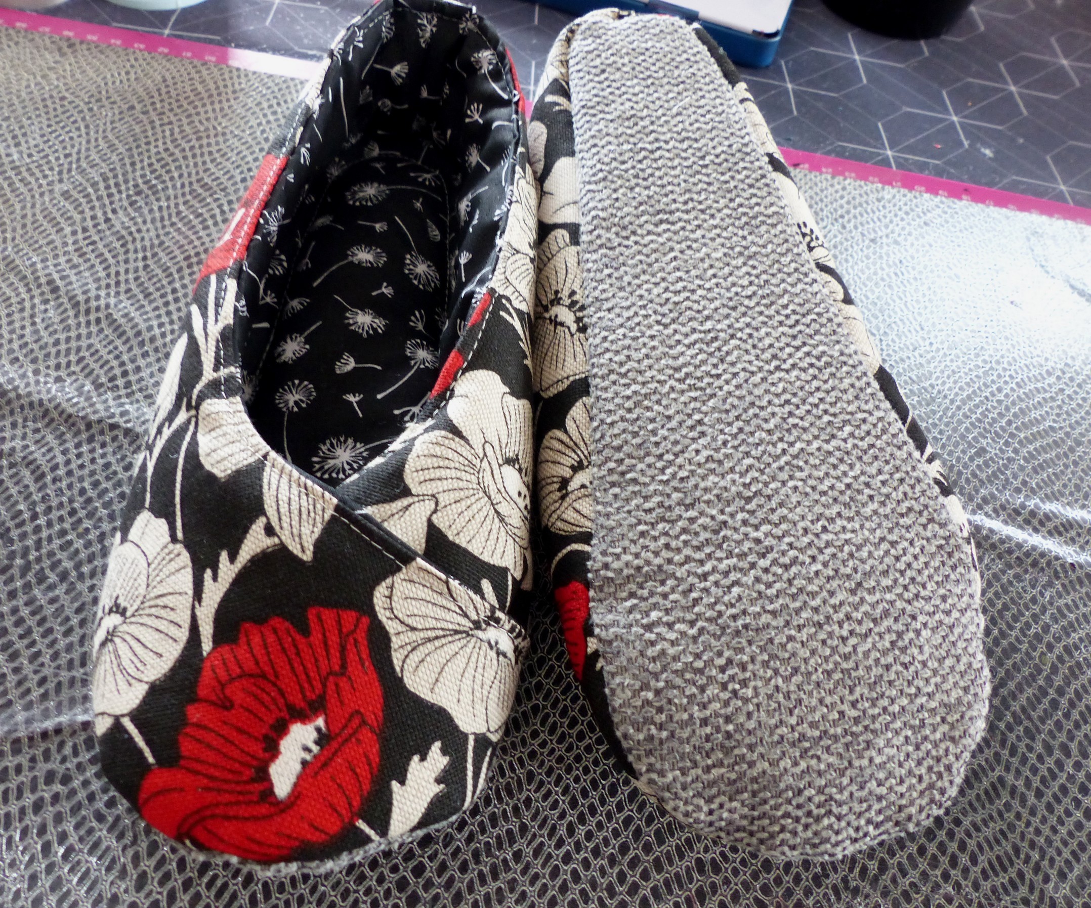 Semelle extérieure en tissu ameublement résistant et souple à la fois, couleur gris.